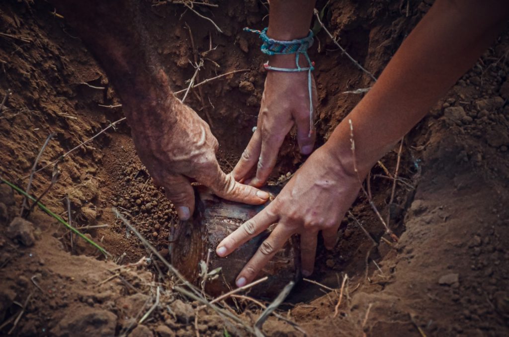 Some of us began digging three long lines of about 30 metres, about a metre wide, while others took a scythe and machete to a nearby thicket to make a pile of mulch. After digging up the lines, and sprinkling them with a bit of rock dust and manure, we planted the seeds, and then the sapling and transplants. These were a mix of all the seeds that we could collectively muster, which included; banana, coffee, tree marigold, cacao, pau brazil, corn, mulberry, bean, different types of palm trees, elephant grass, lemon and orange. Some plants are there to produce a yield, others to support in creating a resilient ecosystem. In Brazil, coffee and cacao are particularly valued in agroforestry systems, as they grow happily in the shade, and produce a very valuable crop. Interspersed between periods of digging and planting, were breaks to eat tasty honey oranges or suck on sticks of sugarcane. The community also provided everyone with a tasty lunch each day of grains and beans that I had never seen before and were very tasty.